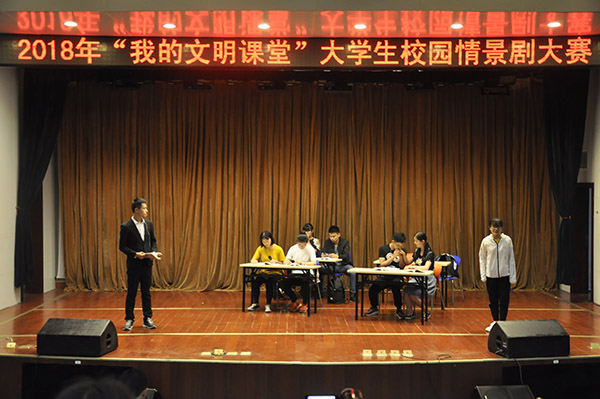5月21日,由我校学生工作部主办的“我的文明课堂”大学生校园情景剧大赛在图书馆第一学术报告厅举行。作为今年“大学生心理健康教育月”活动的重要内容之一,本次比赛以“我的文明课堂”为主题,共有来自11个学院的代表队参加比赛。