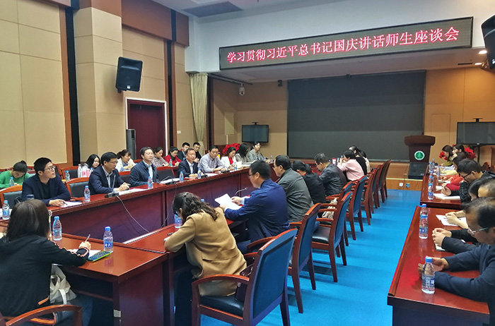 10月12日上午,马克思主义学院在知行楼一楼会议室召开学习贯彻习近平总书记国庆70周年讲话的师生座谈会。校党委副书记刘群英出席会议并讲话。