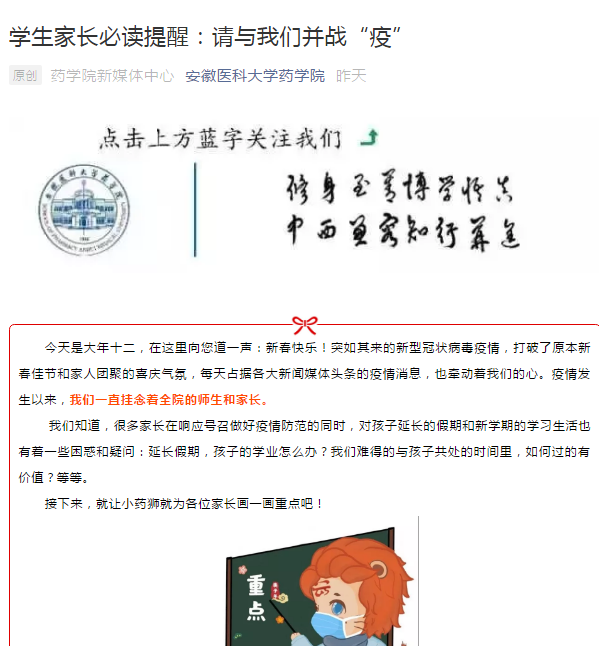 各学院辅导员将防疫工作与思政育人相结合,发挥医学专业特色,引导学生将专业所学转化为宣传动能,组织有特长的同学创作抗疫公益歌曲《请愿书》,歌曲及MV彰显了学校爱国爱民、献身人类健康的优良传统;创作《我与公卫有约——我眼中的新冠肺炎》《不一样的春节》等科普文章和视频,制作《今天,你防疫了吗?》等宣传漫画,并通过校、院公众号平台陆续推送“洗手歌”“如何正确戴口罩”“学穿防护服”等小视频,在“实战”中化理论知识为公共服务。此外,举办“众志成城,抗击疫情”——新型冠状病毒在线知识问答竞赛,向同学们普及有关新冠肺炎的发病症状、传播途径和预防要点,积极鼓励大家向家人普及疫情动态,消除恐慌,树立科学防控观念,弘扬安医精神,唱响安医故事,凝聚安医力量,以实际行动践行初心使命。