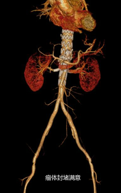 7月10日,在相关学科的密切配合下,手术团队为徐先生进行了全腔内修复手术。医生在徐先生体外给主体支架开四个“窗口”,每个“窗口”分别对应腹腔干动脉、肠系膜上动脉、左肾动脉及右肾动脉这四支人体最重要的内脏分支,体内释放主体支架后通过四个“窗口”将分支支架精准的送入四条内脏动脉分支并打开,顺利解除了胸腹主动脉瘤的威胁。手术时长6小时,徐先生术后经急诊ICU监护治疗一晚后,第二天转回普通病房,并恢复进食及下床活动,无并发症出现,很快将康复出院。术后复查增强CT显示动脉瘤被完全隔绝,内脏四个分支血管严丝合缝,血供良好。