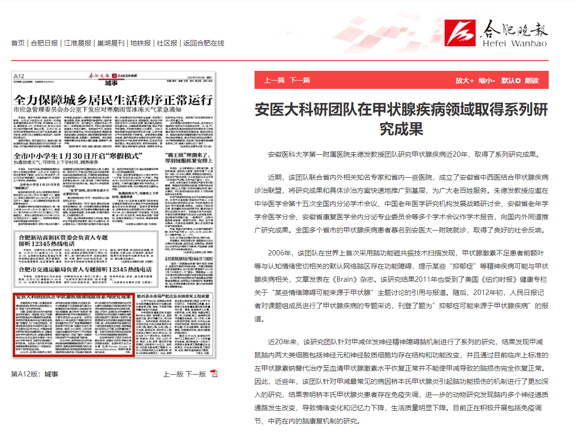 2006年,该团队在世界上首次采用脑功能磁共振技术扫描发现,甲状腺激素不足患者前额叶等与认知情绪密切相关的默认网络脑区存在功能障碍,提示某些“抑郁症”等精神疾病可能与甲状腺疾病相关,文章发表在《Brain》杂志。该研究结果2011年也受到了美国《纽约时报》健康专栏关于“某些情绪障碍可能来源于甲状腺”主题讨论的引用与报道。随后,2012年初,人民日报记者对课题组成员进行了甲状腺疾病的专题采访,刊登了题为”抑郁症可能来源于甲状腺疾病”的报道。