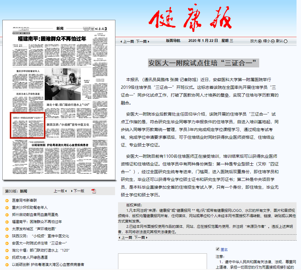 安医大一附院毕业后教育处主任田仰华介绍,该院开展的住培学员“三证合一”试点工作指的是,符合研究生毕业同等学力申报条件的住培学员,自进入培训基地起,同步纳入同等学历教育统一管理,学员3年内完成规定学位课程学习、通过规定考试考核、完成学位申请要求事项后,可于住培结业时同时获得执业医师资格证、住培结业证、专业硕士学位证。