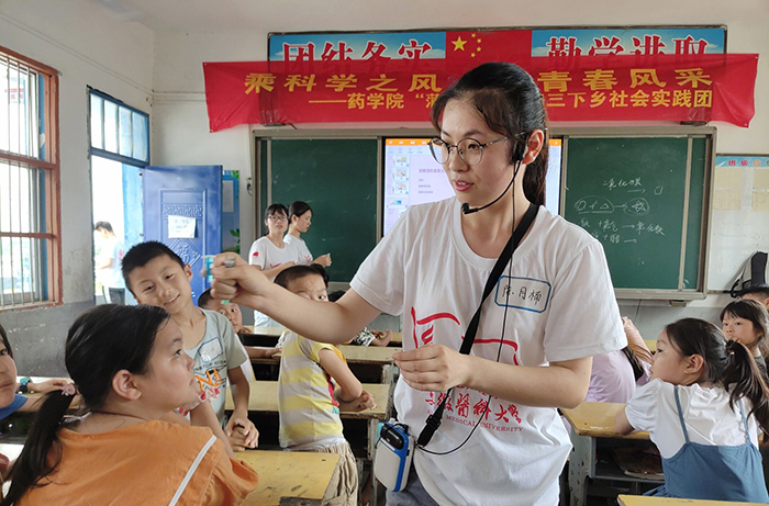 在颍上县尤湖村希望小学的教室里,一堂生动有趣的垃圾分类公益课正在进行。药学院“蒲公英”暑期三下乡社会实践团精心准备科普内容,开展“生物疫苗”“人工智能”“航空航天”等宣传,形成讲科学、爱科学、学科学、用科学的良好风尚。队员们和学生一起制作中药植物标本,在标本上用彩笔补充作画,在孩子们心中种下中医药文化的种子。