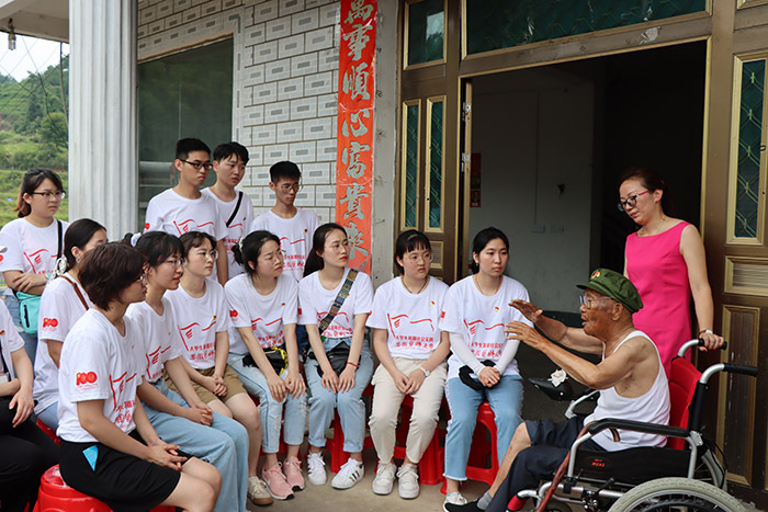 在革命老区太湖县,第一临床医学院“医+N”暑期社会实践团队在辅导员老师的带领下开展党史学习教育,寻访红色印记,开展党史宣讲。在刘畈乡九田村,实践队员冒雨走访慰问了92岁高龄的老兵詹绪凤,聆听老战士讲述红色故事。