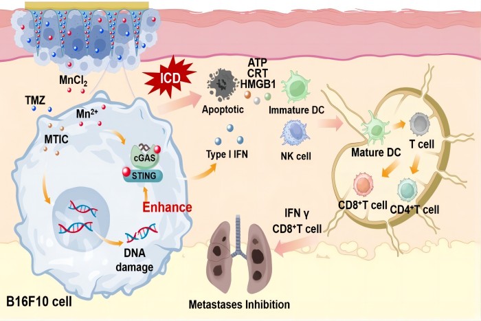 钱海生教授团队在研究中提出,制备透明质酸(HA)微针(HMNs)共载替莫唑胺(TMZ)和MnCl2,使药物局部经皮释放,用于黑色素瘤的协同化学免疫治疗。TMZ是黑色素瘤的一线治疗药物,是一种引起肿瘤细胞DNA损伤的烷化剂。TMZ药物不需要肝脏代谢即可转化为抗肿瘤活性的降解产物(MTIC),因此更适合局部给药。Mn2+已被用于增强cGAS对双链DNA(dsDNA)的敏感性,并进一步激活cGAS-STING通路。该研究期望TMZ通过DNA损伤进一步强化Mn2+诱导的cGAS-STING通路,并与TMZ诱导的ICD联合产生显著的免疫协同效应,为转移性黑色素瘤的治疗提供新的策略与途径。