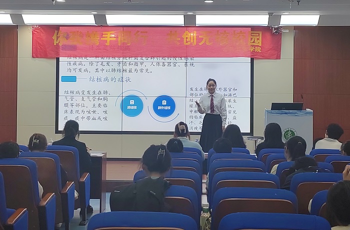 该院在力行楼1420举办“你我携手同行 共创无核校园”为主题的结核病防治宣讲大赛,30名“小卫士”踊跃报名,结合课堂上老师的授课内容和自己查阅文献获取的知识,制作了精美的PPT进行宣讲比拼。比赛现场,大家宣讲了结核病的流行趋势、患病原因、传播渠道、预防措施以及国家相关政策等内容,给现场观众带来了一堂生动的宣传课。该院还将为比赛中表现优秀的选手录制宣传视频,并利用课间在各个班级中播放,进一步扩大宣传覆盖面和影响力。