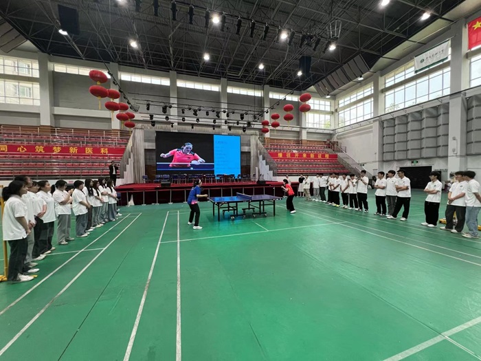 活动以提问对话的方式展开,包括冠军历程分享、学生提问交流、现场互动体验等环节。该院体育部教师文佳是国家乒乓球队原队员,曾获世界青年乒乓球锦标赛单打冠军、全国乒乓球锦标赛女单冠军。作为主讲人,她与学生们分享了自己的成长故事,结合实例阐述了顽强拼搏的精神、锲而不舍的品质在成长中的重要作用,深入探讨“战胜自我、超越自我”的体育精神,让同学们感受到敢于亮剑、迎难而上的体育精神。省运会高校大学生乒乓球女团冠军成员、2021级临床药学专业学生罗一后就如何平衡专业学习和训练比赛进行了经验分享。